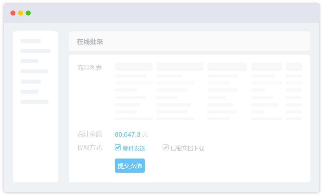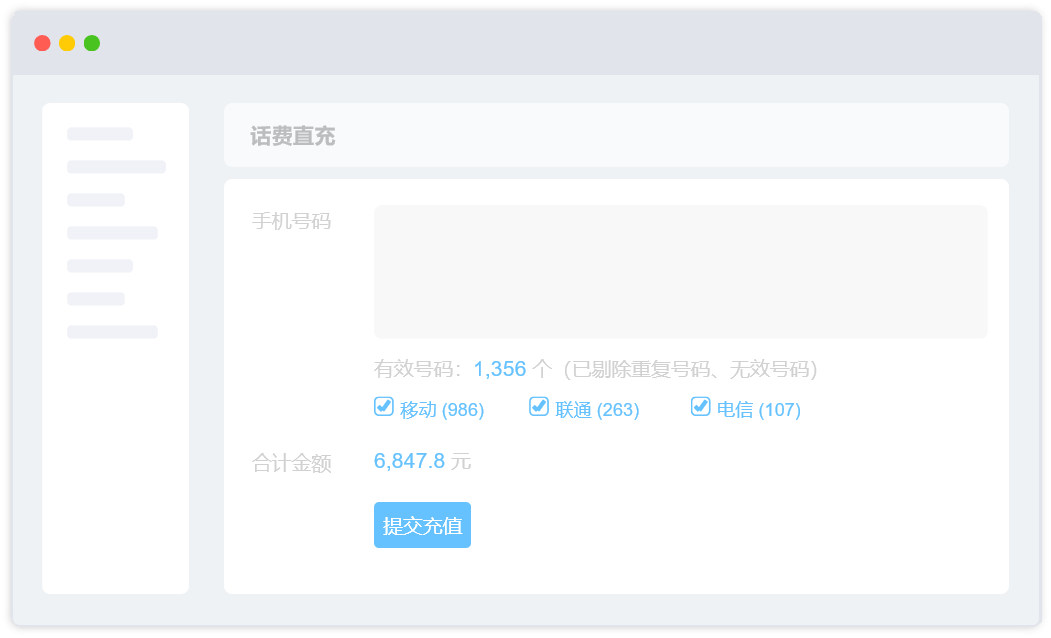 以文件模板形式批量導入信息,實現一鍵直充。批量采購充值卡,以兌換碼形式提取